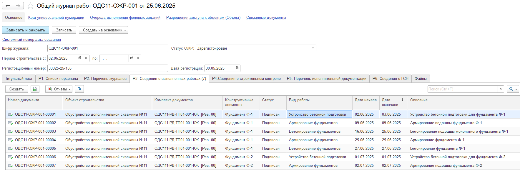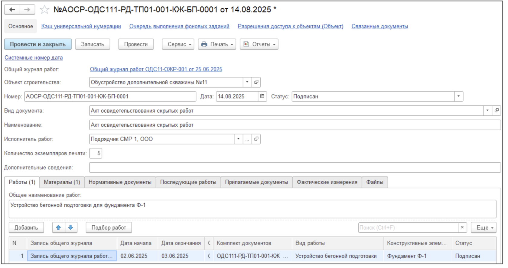 Electronic forms of as-built documentation reports have been developed, linked to entries in Section 3 of the general work log, as well as regulatory and accompanying documents. A printed form of reports has been developed in accordance with Order No. 344 of the Ministry of Construction of the Russian Federation dated May 16, 2023, with the ability to generate as-built documentation registers.