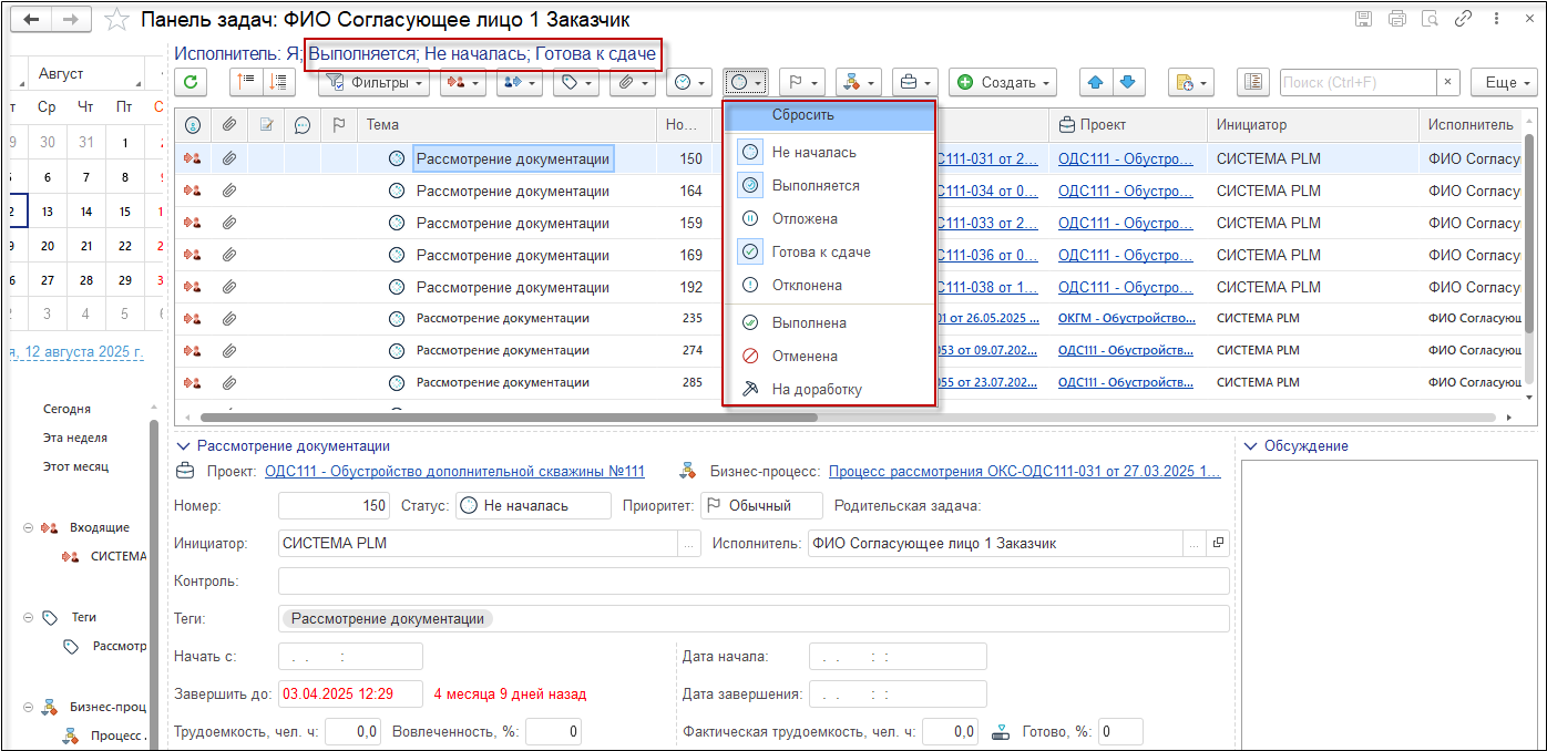 Changes have been made to the "Taskbar" interface, improving the selection of tasks by status. Users can now see information about the established filter, allowing for more efficient task management.Multiple filtering has been added: users can simultaneously enable and disable selected filters. This will allow for more flexible task display customization based on specific needs.