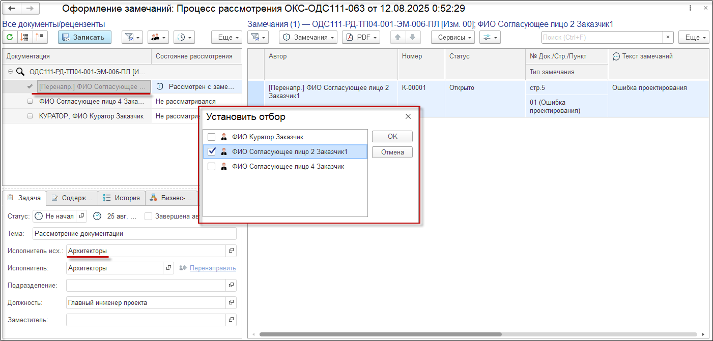 As part of the latest update to Appius-PLM TDO, significant improvements were made to the documentation review business process. Access verification for business process participants to the information base has been improved. In the new version, access verification has become more flexible and accurate. It now involves not only the business process participants themselves but also their deputies, reducing the risk of errors during the process.The comment submission window interface now features filtering by the current reviewer if they are part of a group of performers. This allows users to quickly find all comments issued by a specific reviewer.
