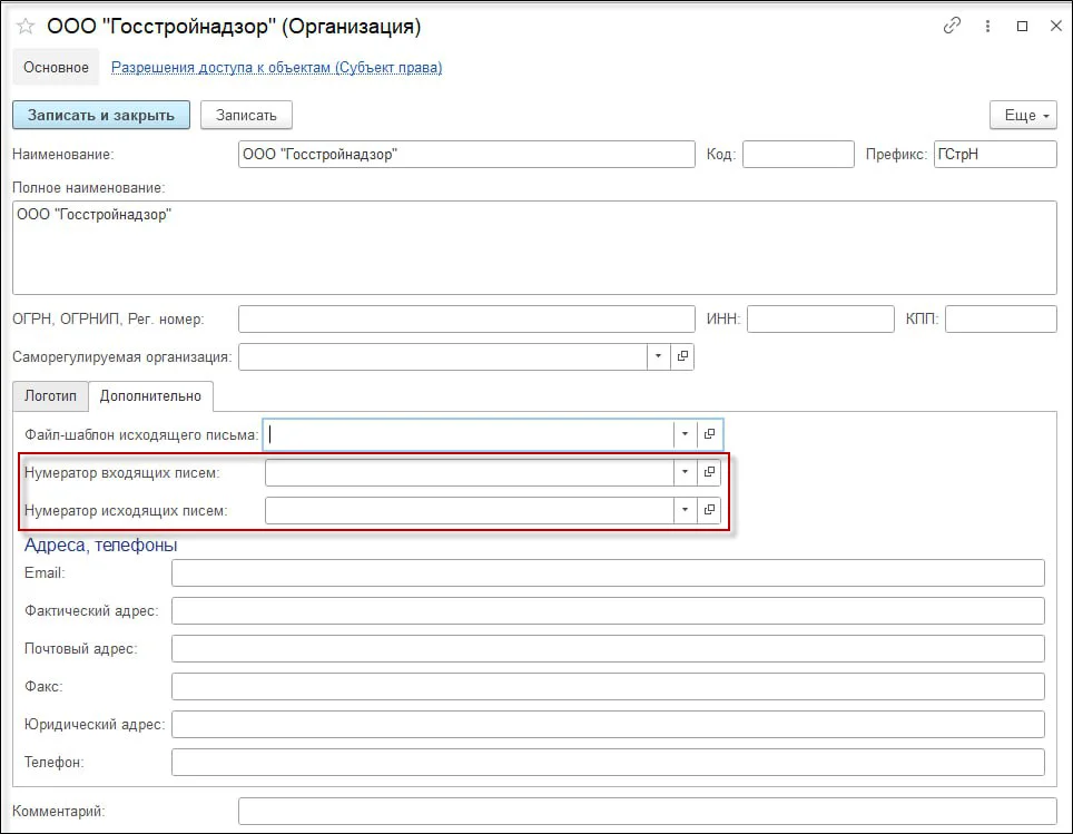 The "Incoming Message Numbering" and "Outgoing Message Numbering" fields have been added to the "Organizations" directory. Users can now configure unique numbers for incoming and outgoing correspondence within each specific organization.