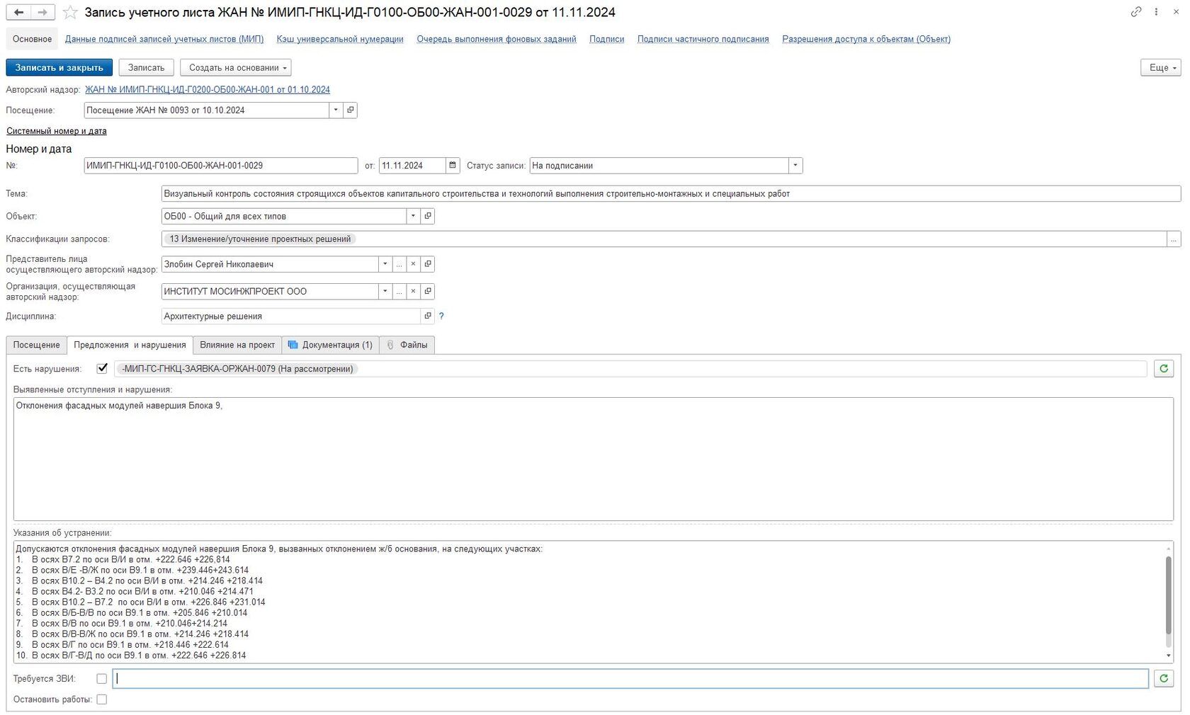 Рис. 12. Запись в учетном листе журнала авторского надзора
