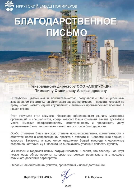 «Мы гордимся тем, что наша система внесла существенный вклад в успешную реализацию такого масштабного проекта, как Иркутский завод полимеров» – отметили представители ООО «АППИУС-Цифровые решения». – «Благодарность от ИЗП подтверждает востребованность цифровых решений в современном строительстве. Мы продолжим развивать и поддерживать нашу систему, чтобы обеспечить дальнейший успех завода».