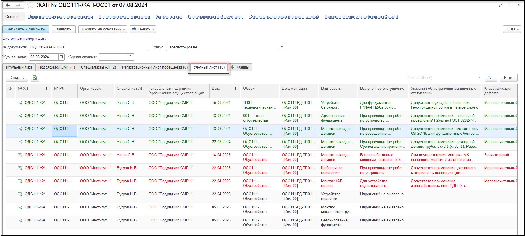 На форме учетного листа есть возможность записывать предложения и нарушения с указанием классификации дефекта.