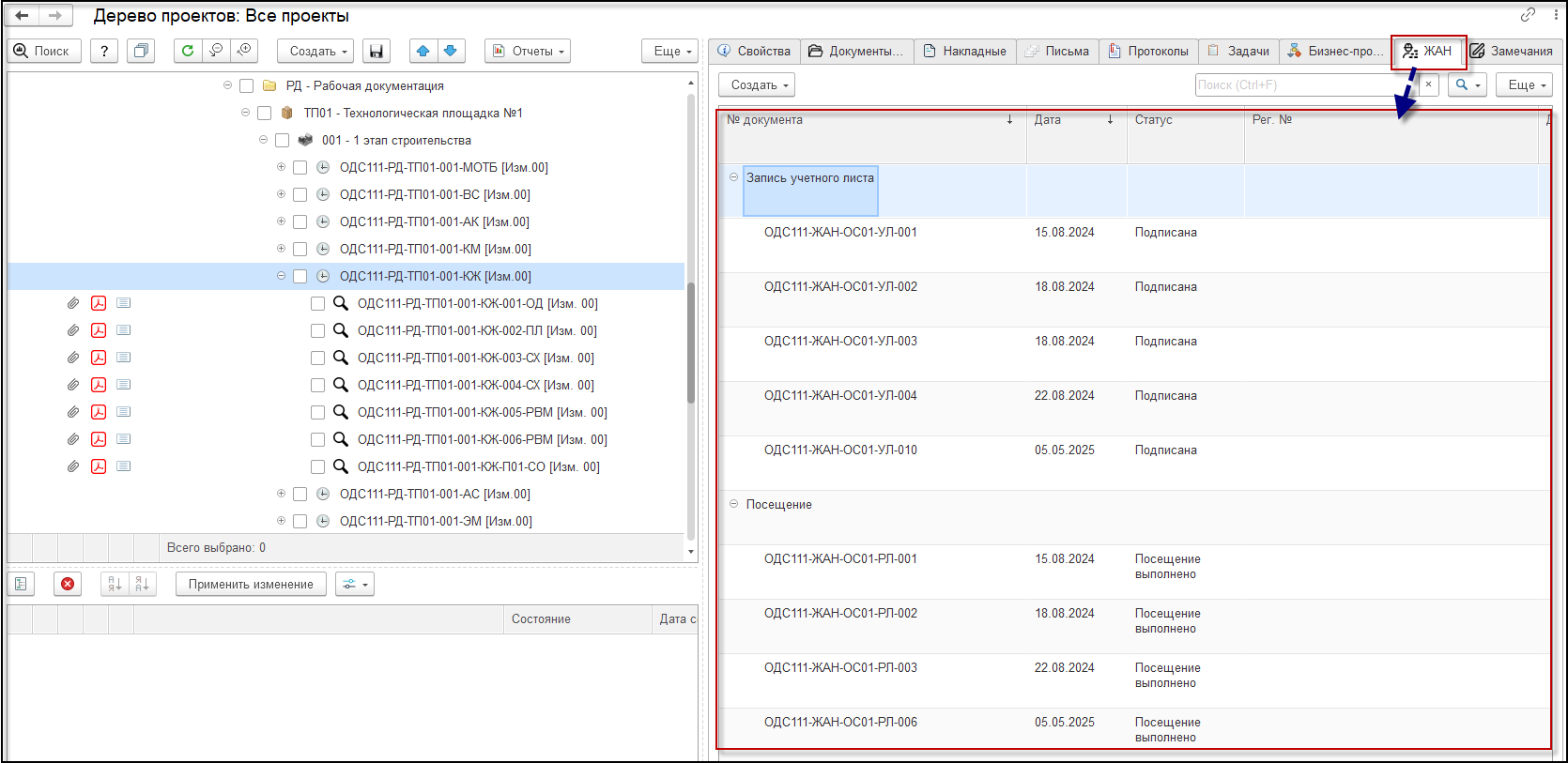 Для быстрого перехода от комплекта РД к данным журналов в интерфейс «Дерево проектов» добавлена закладка «ЖАН».