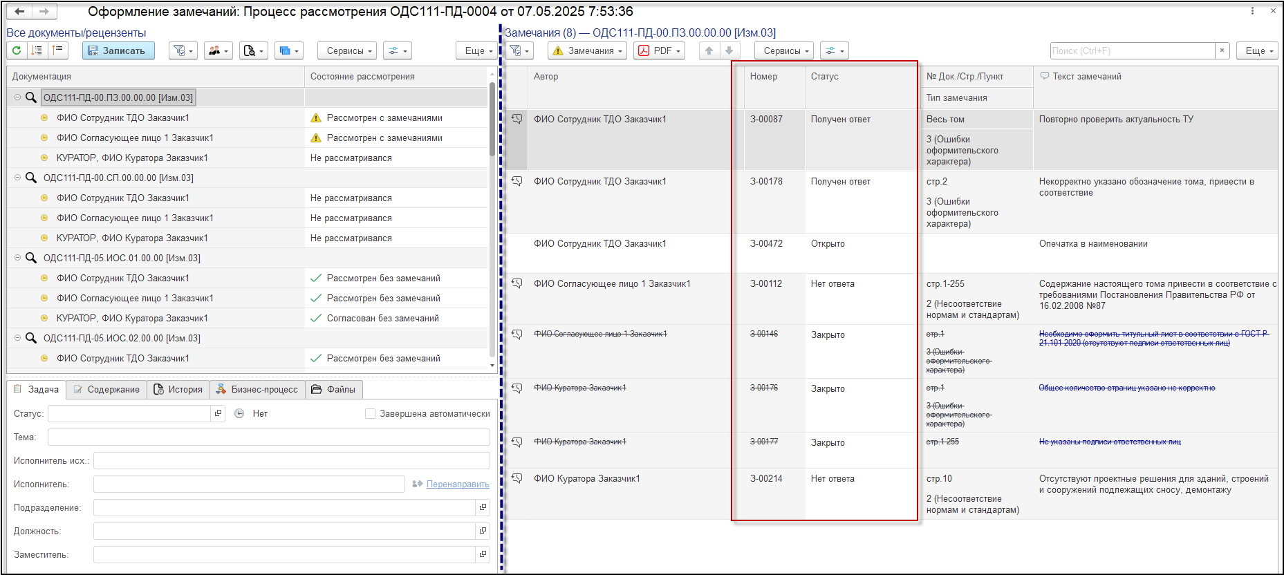 В новой версии основательно переработано окно оформления замечаний. Замечания теперь отображаются в правой части формы. Каждое замечание добавляется отдельной строкой, имеет уникальный номер и статус в соответствии с обновленной процедурой управления документации проекта.