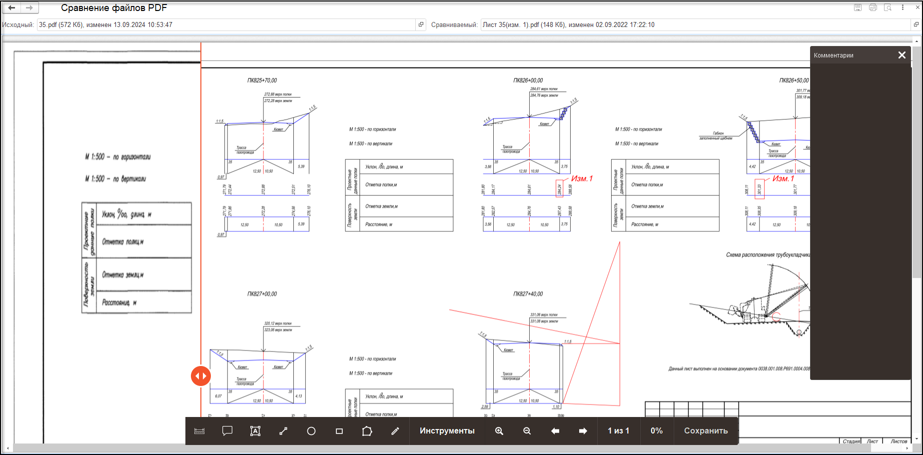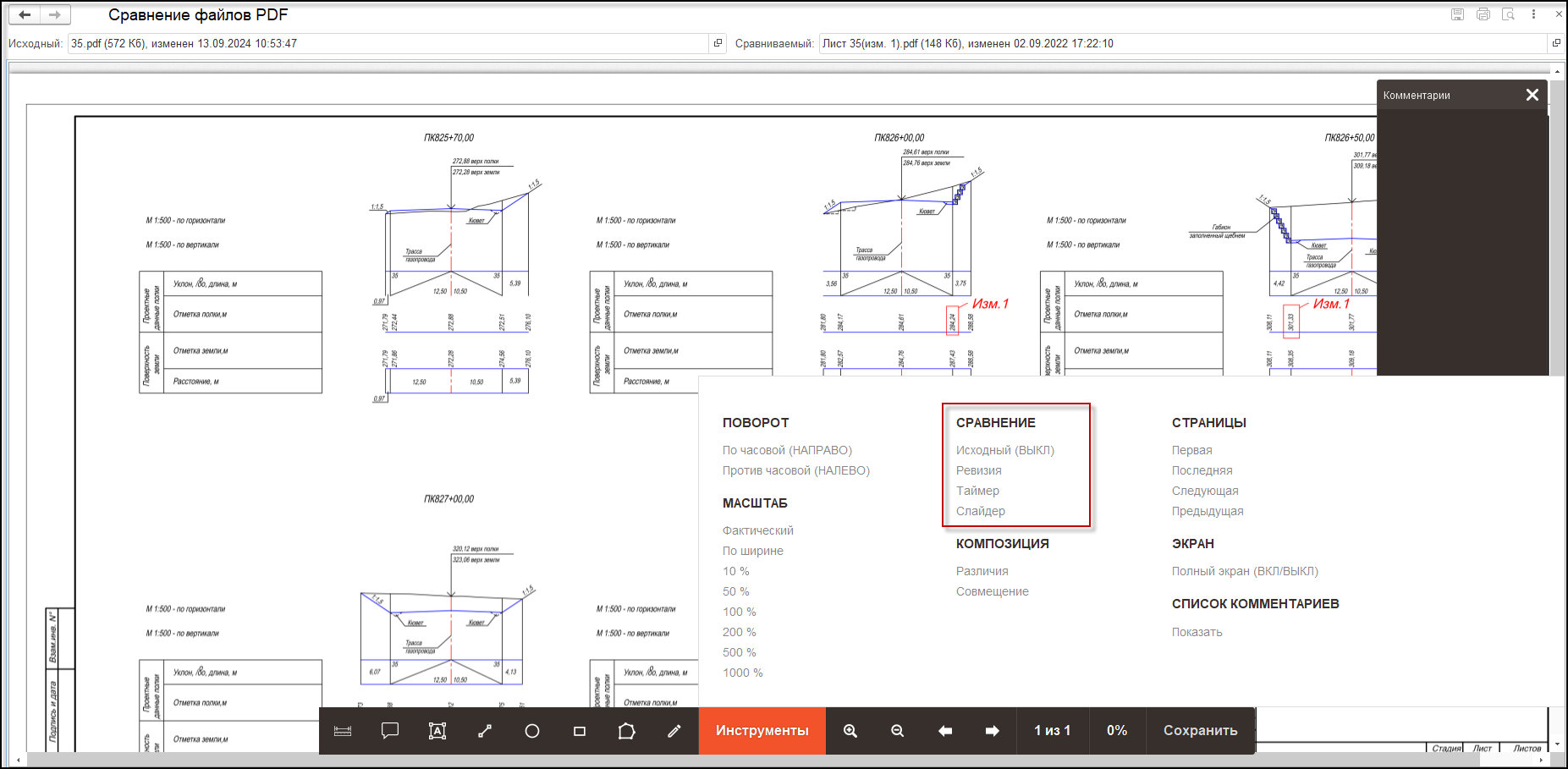 В меню «Инструменты» реализована возможность изменения масштаба, быстрой навигации по файлу. В новой версии модуля добавлены дополнительные варианты сравнения файлов.
