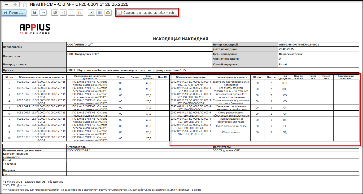 Реализована новая печатная форма исходящей накладной. Команда «Сохранить в накладную (xlsx + pdf)» перенесена из формы отчета «Списка документации» в форму табличного документа.