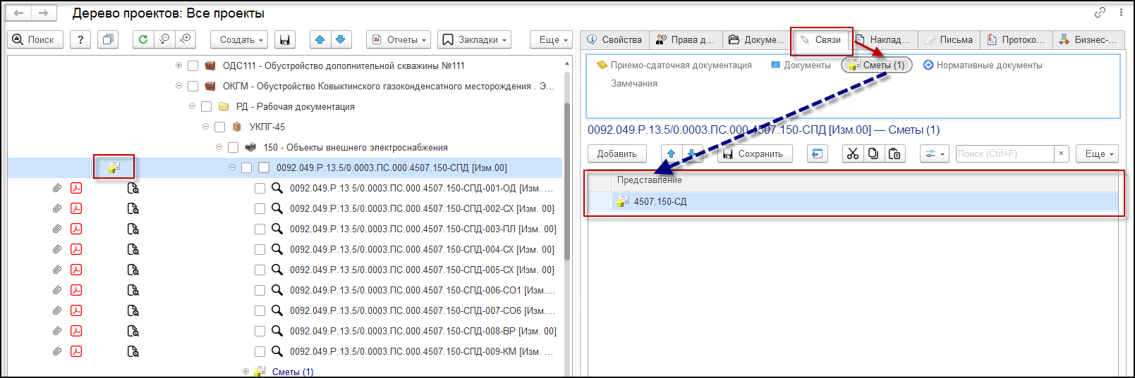 В интерфейс «Дерево проектов» добавлена новая закладка "Связи", на которой отображаются все имеющиеся горизонтальные связи документов с возможностью создания новых связей непосредственно на закладке.