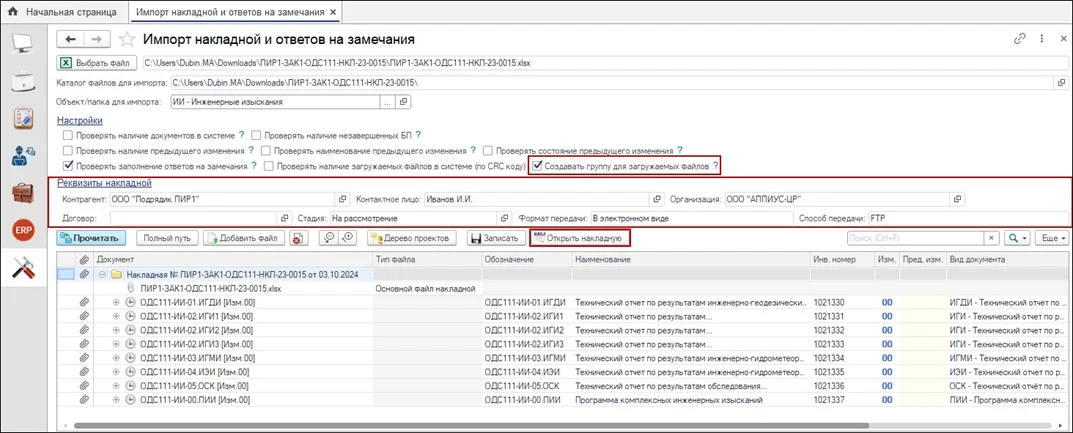 В новой версии обработка «Загрузка накладной и ответов на замечания» адаптирована под работу с новой входящей формой в соответствии с процедурой. В обработку внесены следующие изменения: