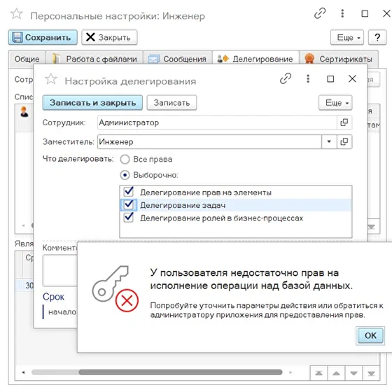 В механизме делегирования добавлено ограничение на изменение настроек делегирования сотрудником, являющимся заместителем. Теперь сотрудник, назначенный заместителем, не имеет прав на изменение настроек делегирования.