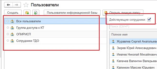 Реализована синхронизация данных по организации, должности и подразделению справочника «Пользователи» при заполнении данных в справочнике «Сотрудники». Для удобства поиска конкретного пользователя реализована возможность отбора поиска по группам, а также добавлен «быстрый отбор» по действующим сотрудникам.