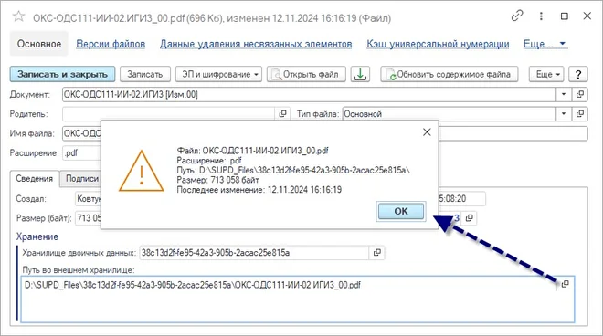 В форме свойств файлов для роли «Администратор» добавлена возможность просмотра подробной информации о файле во внешнем хранилище.