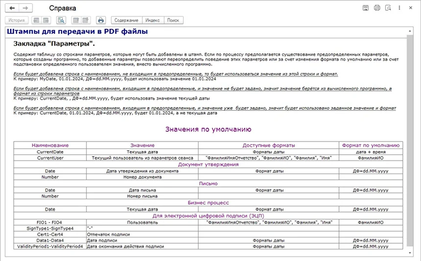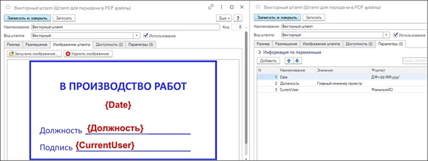 В форму «Штампа для передачи в PDF файлы» для вида штампа «Векторный» добавлена закладка «Параметры». На данной закладке задаются значения и форматы для параметров, указанных в штампе. Список предопределённых параметров и их форматов доступен в разделе «Информация по переменным».