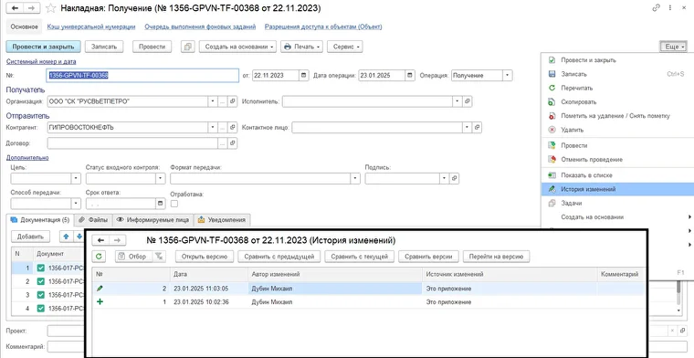 В открывшемся окне «История изменений» будет отчёт о редактировании документа или справочника с датой изменения и именем пользователя, сделавшего корректировки. Для просмотра деталей нужно нажать кнопку «Открыть версию».