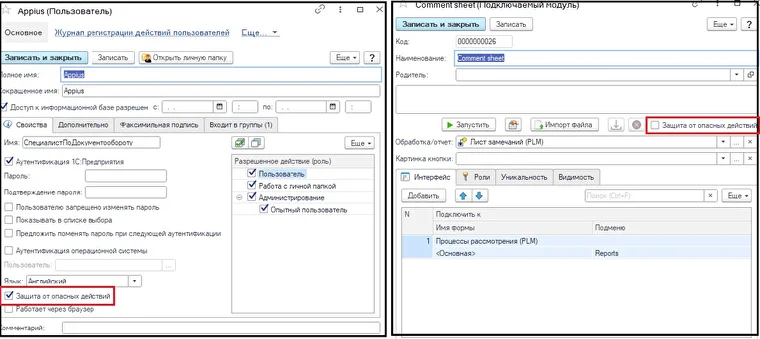 В справочники «Пользователи» и «Подключаемые модули добавлен флаг «Защита от опасных действий».