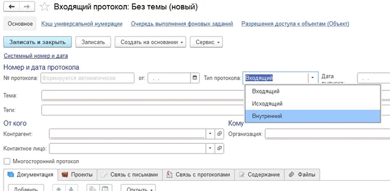 В документах "Протоколы" добавлена возможность выбора нового типа протокола "Внутренний".