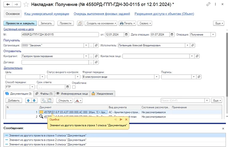 С целью корректного заполнения документов (накладные, утверждения документации и т. д.) доработана проверка принадлежности документации к проекту. В случае добавления документации (с учётом ревизий) из разных проектов появится сообщение об ошибке с указанием строки, имеющей несоответствие.