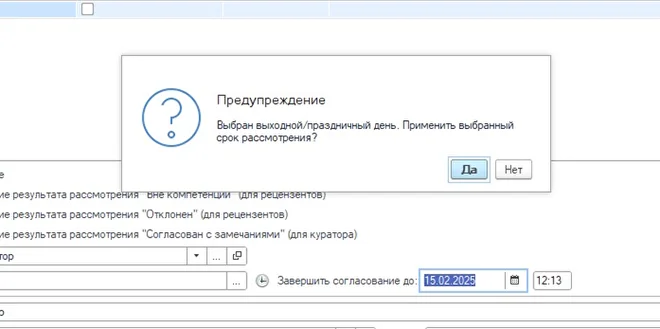 В случае выбора выходного дня добавлено предупреждение с соответствующим сообщением и возможностью принять или отклонить выбранный срок рассмотрения.