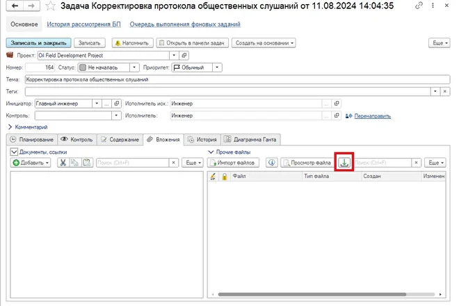 В форме задачи на закладке «Вложения» добавлена кнопка, позволяющая выгрузить приложенные файлы на диск.