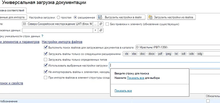 В новой версии Системы в обработку «Универсальная загрузка документации» добавлена возможность выбора настройки поиска и загрузки файлов.
