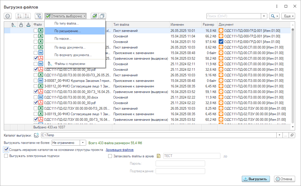 Выгрузка файлов по проекту для передачи подрядчику/заказчику