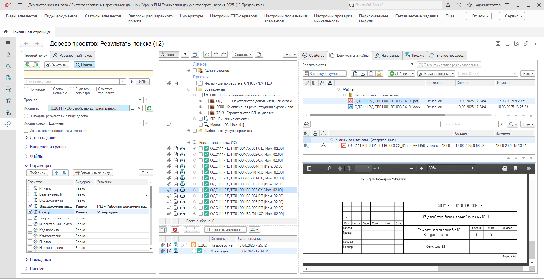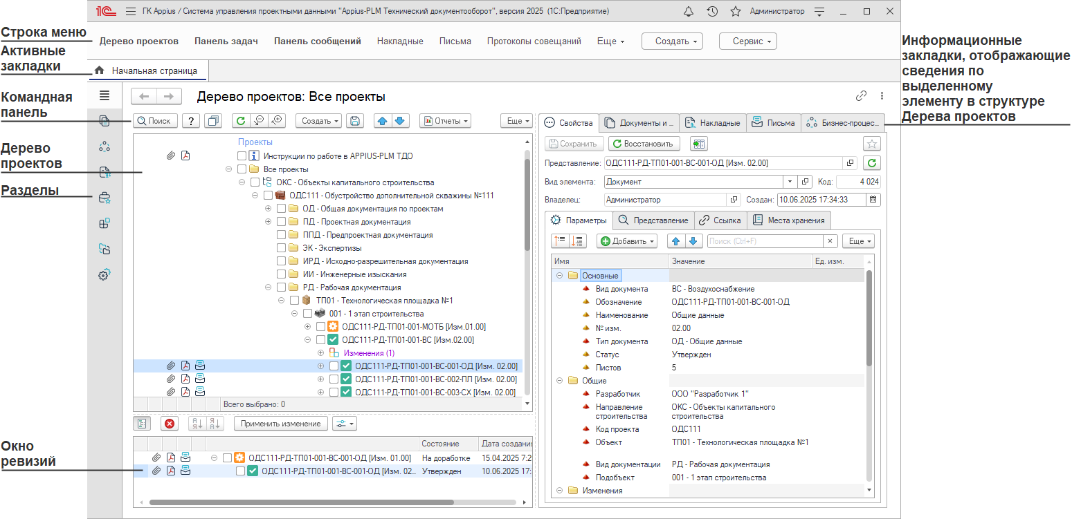 Основным интерфейсом электронного архива в системе является дерево проектов. В нем сосредоточены действия по управлению структурой проекта, жизненным циклом документов и их изменениями, формированию отчетов и т. д. В виде закладок отображается связанная с текущим элементом информация: свойства, права доступа, применяемость, файлы, накладные, задачи, бизнес-процессы и т. д.