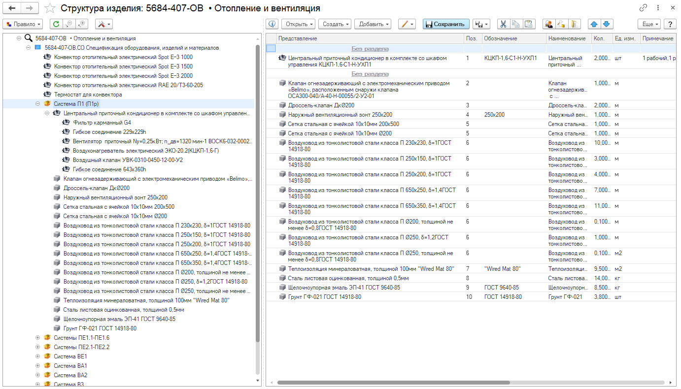 Система позволяет сформировать ведомость объемов работ (ВОР) и спецификацию оборудования и материалов (СО). Элементами данных документов являются: оборудование, материалы, стандартные и прочие изделия, работы. Для удобства работы с ограничительным перечнем создан специальный инженерный справочник, элементы которого связываются со справочником номенклатуры. Непосредственное формирование состава ВОР и спецификации происходит в окне управления структурой.