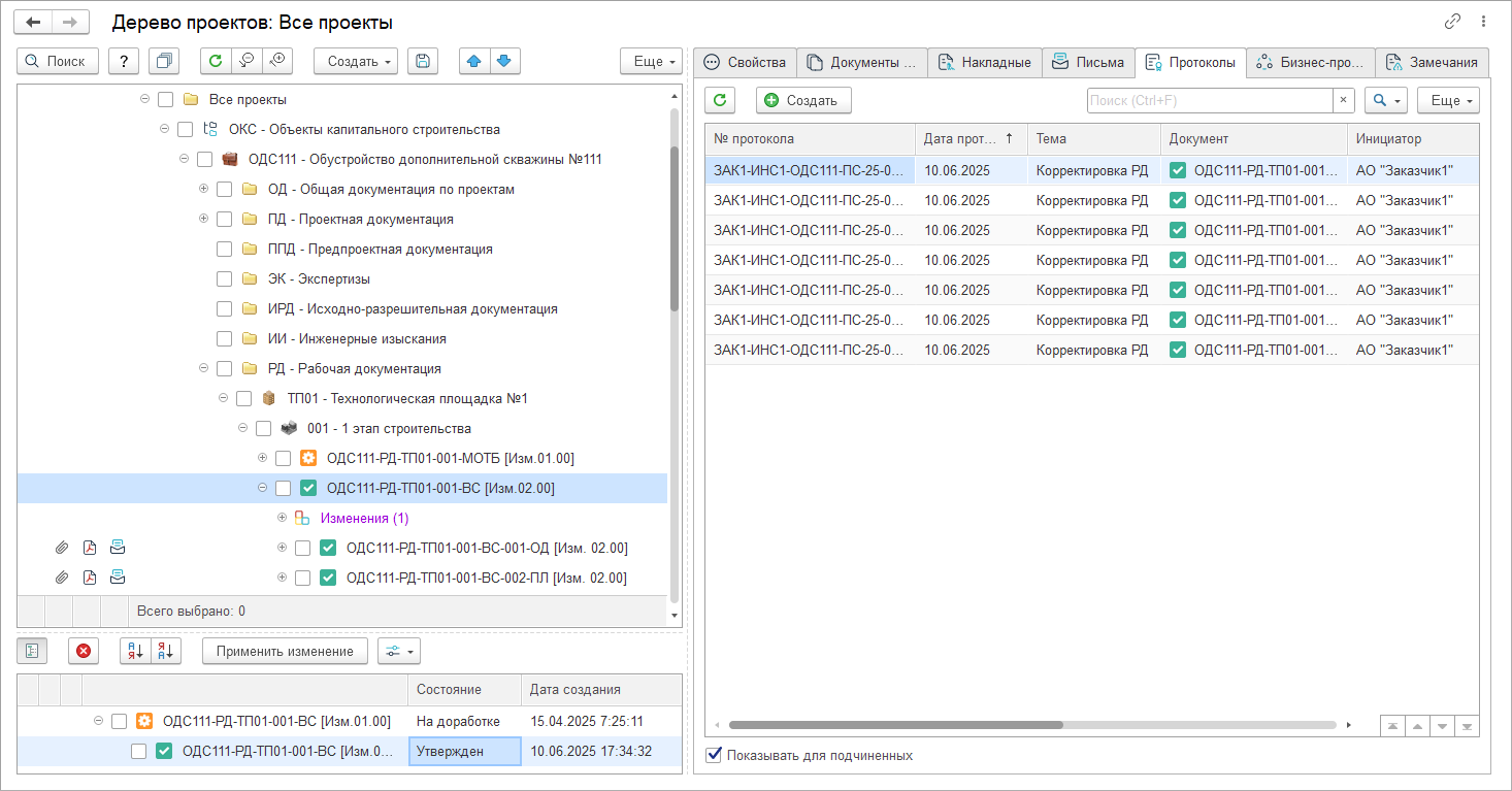 Для быстрого перехода от документа к протоколу интерфейс «Дерево проектов» добавлена закладка «Протоколы».