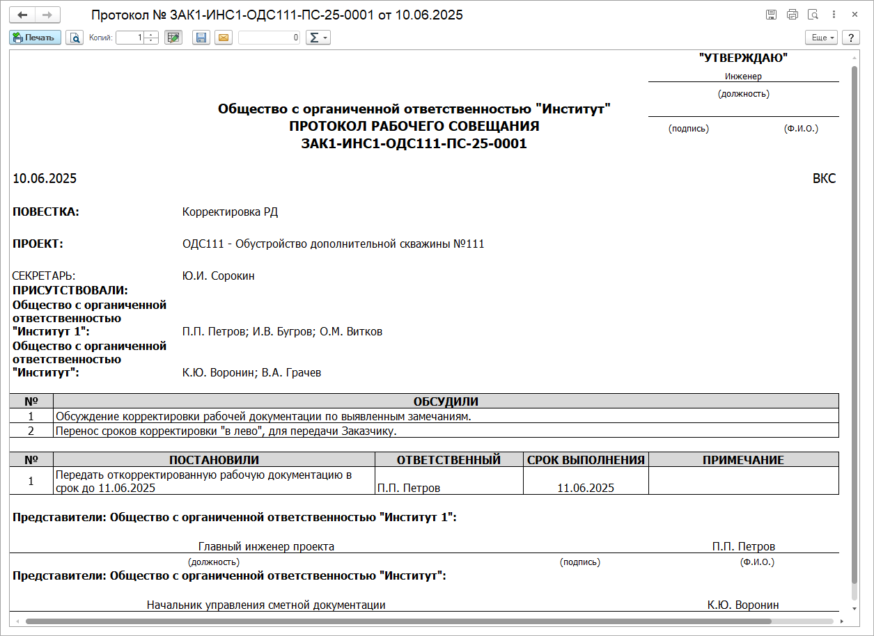 Печатная форма протокола создается с учетом индивидуальных требований заказчика.