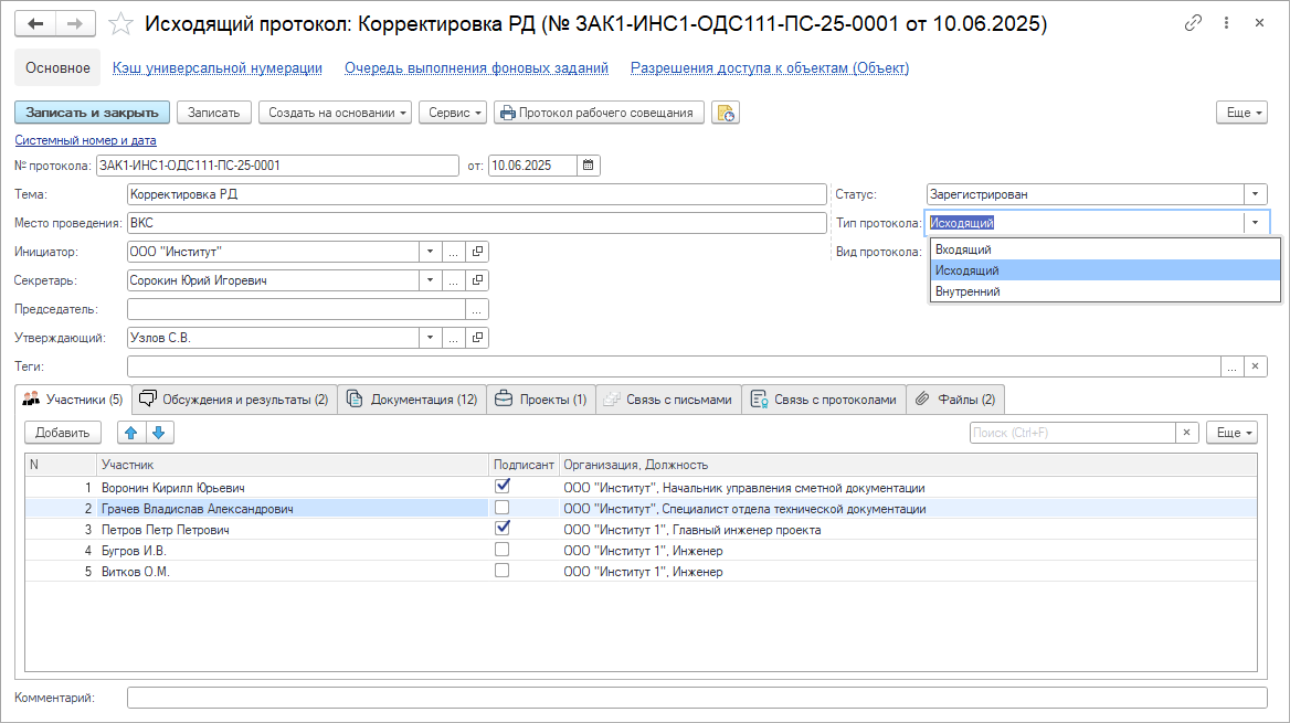 - Реквизиты: № протокола, дата протокола, тема протокола, инициатор, место проведения, секретарь, председатель, утверждающий, теги, статус, тип протокола, вид протокола;