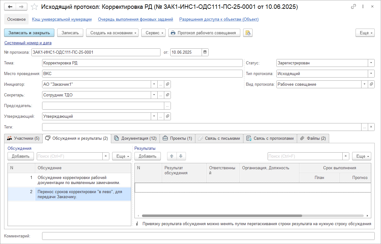 - Закладки: «Участники», «Обсуждения и результаты», «Документация», «Проекты», «Связь с письмами», «Связь с протоколами», «Файлы»;